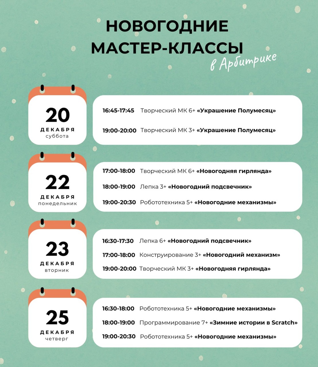 ! 🔎 ❄️ 20 ДЕКАБРЯ, СУББОТА ❄️ 16:45 — Творческий МК 6+ «Украшение Полумесяц» 19:00 — Творческий МК 3+ «Украшение Полумесяц» ❄️ 22 ДЕКАБРЯ, ПОНЕДЕЛЬНИК ❄️ 17:00 — Творческий МК 6+ «Новогодняя гирлянда» 18:00 — Лепка 3+ «Новогодний подсвечник» 19:00 — Робототехника 5+ «Новогодние механизмы» ❄️ 23 ДЕКАБРЯ, ВТОРНИК ❄️ 16:30 — Лепка 6+ «Новогодний подсвечник» 17:00 — Конструирование 3+ «Новогодний механизм» 19:00 — Творческий МК 3+ «Новогодняя гирлянда» ❄️ 25 ДЕКАБРЯ, ЧЕТВЕРГ ❄️ 16:30 — Робототехника 5+ «Новогодние механизмы» 18:00 — Программирование 7+ «Зимние истории в Scratch» 19:00 — Робототехника 5+ «Новогодние механизмы» Подарить своему ребенку Новогоднюю сказку: ✏️ На нашем сайте 📞 У Администратора @arbitrika_admin С любовью, Арбитрика 💌 Ииии новая буква кодового слова — А 🤫 Уже догадались?