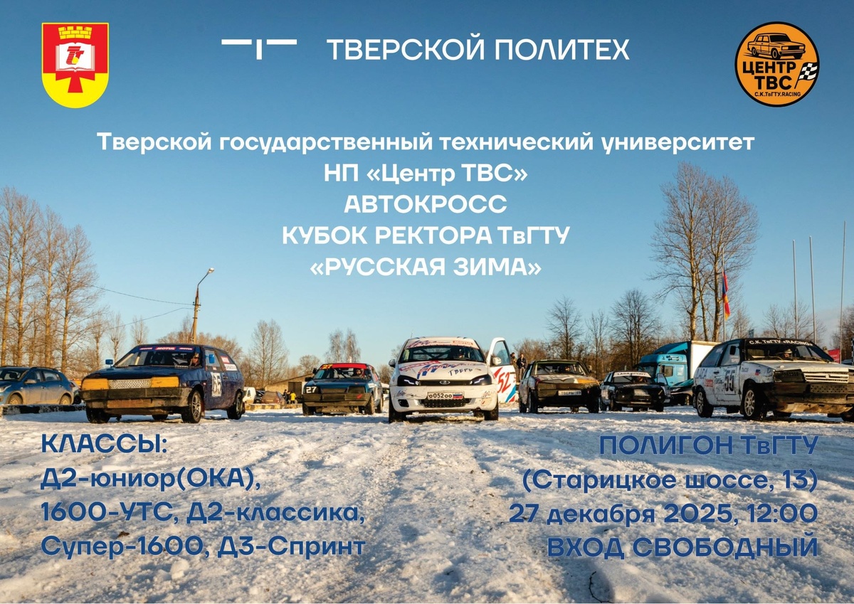 В программу включены состязания в классах Д2-юниор (ОКА),1600-УТС, Д2-классика, Супер-1600, Д3-Спринт. 📆Когда: 27 декабря 2025 года, начало в 12:00. 📍Где: Старицкое шоссе, 13 (полигон ТвГТУ). Вход свободный! #ТвГТУ #Политех #спорт_ТвГТУ #автокросс