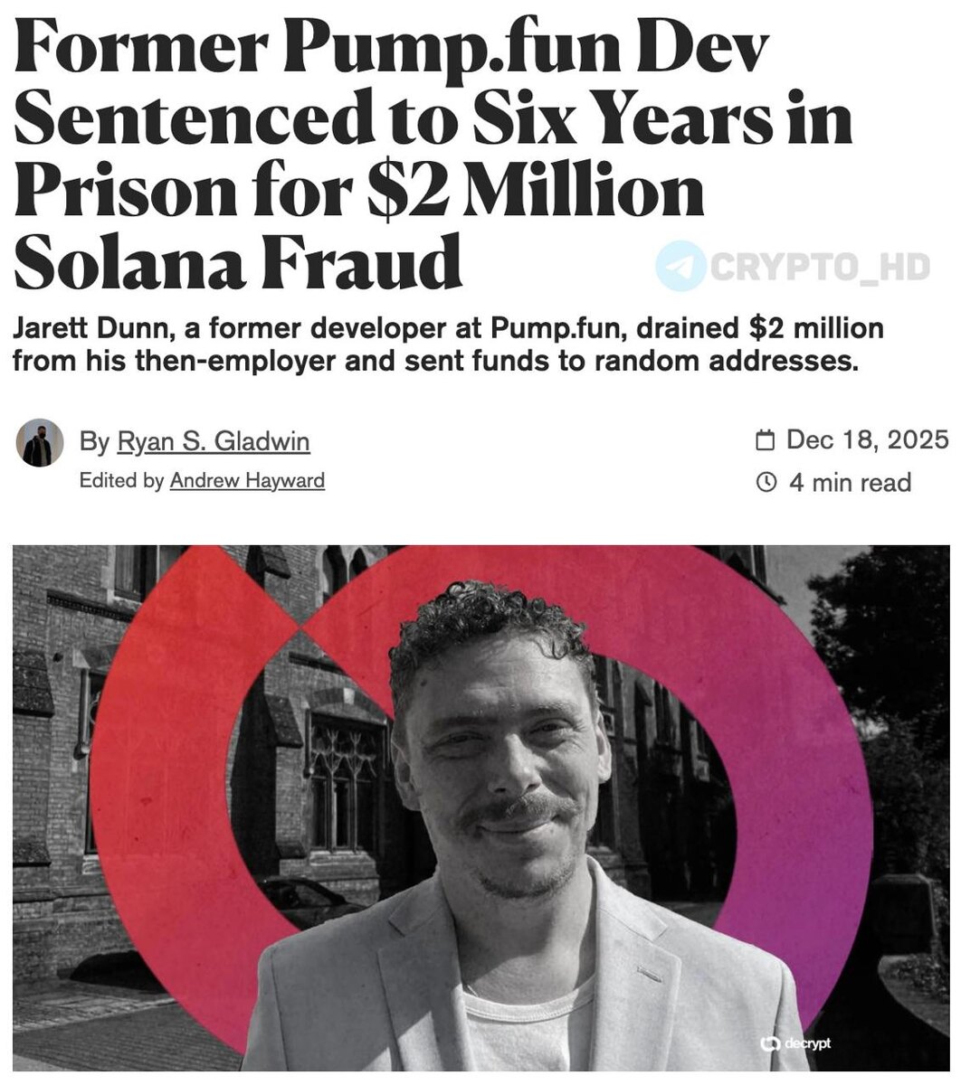👮 «Криптовалютный Робин Гуд» приговорен к 6 годам тюрьмы. ➥ В мае 2024 года Джаретт Данн вывел около $2m в Solana со счетов Pump․Fun, проработав там всего шесть недель. ➥ Вместо того, чтобы присвоить деньги, он распределил средства между тысячами случайных кошельков и сразу же признался в содеянном в соцсетях. Это принесло ему репутацию «криптовалютного Робин Гуда» среди части комьюнити. ➥ Экс-разработчик Pump․Fun пытался представить свои действия как разоблачение мошеннической платформы, но суд не принял эту версию. Его арестовали через четыре дня после инцидента в лондонском отеле. Ранее: пророчества о крахе Solana Crypto Headlines