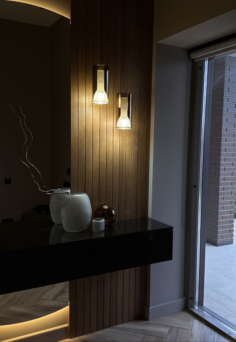 Эта прихожая - про порядок и эстетику с первого взгляда. Она сразу даёт понять, что в этом дома царят спокойствие и уверенность. В этом интерьере моя команда провела большую работу с пропорциями и материалами: тёплое дерево, спокойные нейтральные стены и чёткая геометрия без визуального шума. Главный акцент здесь - это встроенная система хранения из светлого дерева. Она не дробит пространство, а наоборот, вытягивает его по высоте и делает прихожую визуально чище. Закрытые фасады отвечают за порядок, а открытые ниши дают место для деталей, например, книг и декора. Отдельного внимания заслуживает зеркало со скрытой подсветкой. Оно не просто функциональное, а работает как световой элемент: мягко расширяет пространство, добавляет глубины и подчёркивает фактуры дерева и стен. Подсветка встроена так, чтобы не ослеплять, а создавать ровное, комфортное свечение. Это помогает сразу воспринимать прихожую «живой». Пол из дерева, уложенный ёлкой, поддерживает ощущение уюта и визуально связывае