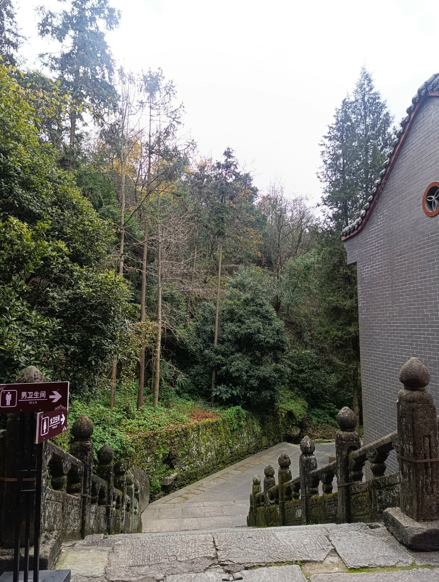 Я успела до снегопада исследовать пешеходную дорожку, которая начинается от храма Фу Чжэн, остановка 太子坡. Чтобы её найти надо пойти по указателю туалет. Чтобы исследовать дорогу я приехала утром, туримтичекие автобусу на горе бесплатные ( действует один билет купленный при входе). Дорога шла по склону горы, мимо чайных плантаций, потом я вышла к даосской школе ушу. Там была площадка для занятий, учебный класс, народу никого не было, кроме маленького котёнка, которого я угостила, предусмотрительно привязанным с собой пакетиком Вискас (кошки в Китае худые и голодные). Тут же располагается небольшой храм. На доме висела доска с, примерно, такой надписью: