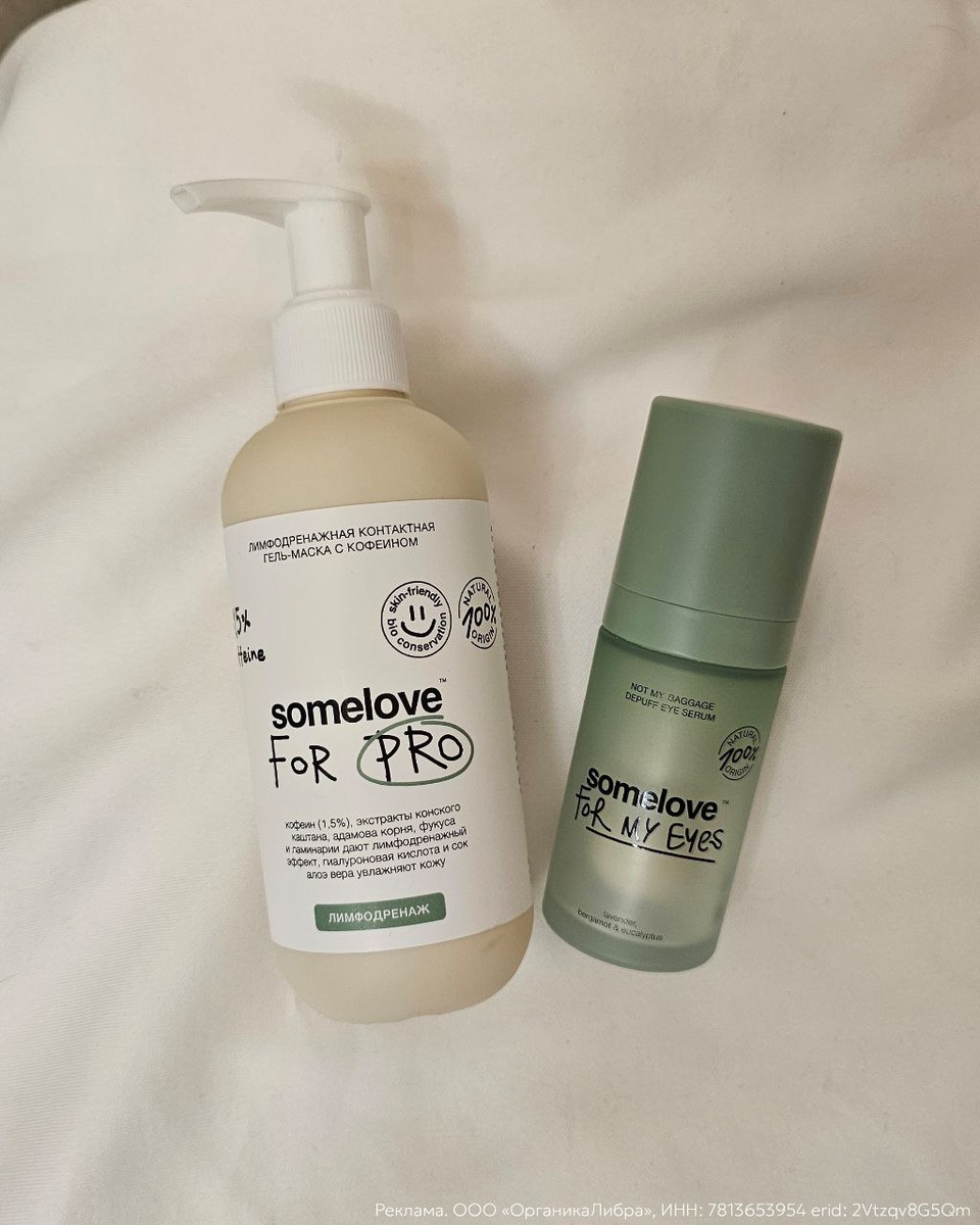 Но увы, на дворе декабрь: месяц тысячи дел, дедлайнов и общего «держусь на кофеёчке». Когда времени нет совсем, перехожу на универсальный уход и ищу готовые комбо-решения И вот что спасает меня последние недели: лимфодренажный набор от Somelove. Баночки идеально дополняют друг друга, сохранила в свой вишлист и в список подарков для подружек Сцена: утро. Я, недосып и набухшая мордашка. Умываюсь и сразу беру гель-маску. Её можно: • просто нанести и побежать завтракать. Сама поработает и впитается • или, если повезло с 10 минутами свободной жизни, пройтись сверху микротоками Что вижу по эффекту: 1. Мощное увлажнение и чувство свежести. Гиалуронка, алоэ, глицерин: классика, которая реально работает. 2. Выраженный лимфодренаж. Вот ради этого маска и создана: кофеин + водоросли + конский каштан + адамов корень → запускают микроциркуляцию и снимают утренние отёки так, что лицо буквально «сдувается» 3. Тонус и упругость. Минералы из водорослей дают плотность и «собранность» кожи. 4. Лёгкий