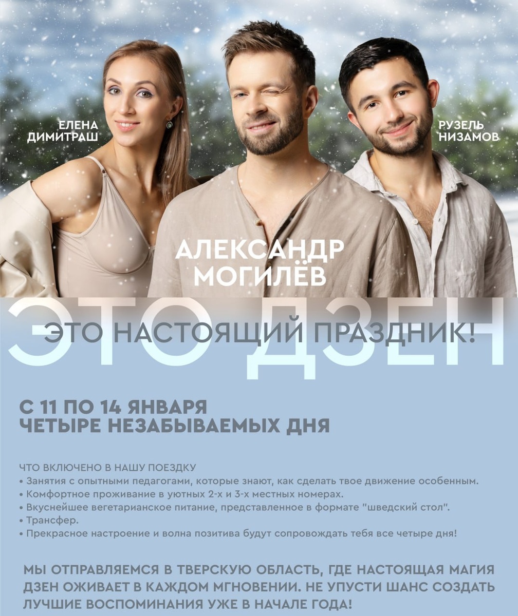 Поэтому приглашаем вас в ЗИМНИЙ ДЗЕН! Выездная перезагрузка в эко-отеле под Тверью 11–14 января, от наших партнеров •ЭТО• школы танца Александра Могилёва. Что вас ждёт: 🌟Танцевальная практика осознанного движения "ЭТО ЛЮДИ". 🌟 Йога и медитации – для восстановления гармонии ума и тела. 🌟 ЭТО зарядка – утренние практики для пробуждения энергии. 🌟 Музыкальный мастер-класс – от Рузеля Грува. 🌟 Лаборатория – творческие и исследовательские занятия. 🌟. Сontemporary – уроки современного танца. 🌟 Итоговая съёмка клипа – каждый участник станет звездой общего творческого проекта. ДЗЕН подарит вам не только новые навыки, но и внутренние лёгкость и баланс, которые перезагрузят нервную систему, зарядят радостью и энергией на месяцы вперед. 95% участников возвращаются с ощущением отдыха, как после долгого отпуска. Возраст 15+ Танцевальный опыт не требуется Всё включено! 🌟 трансфер из Москвы и обратно (перерасчет стоимости, если Вы из другого города) 🌟проживание в комфортабельных номерах