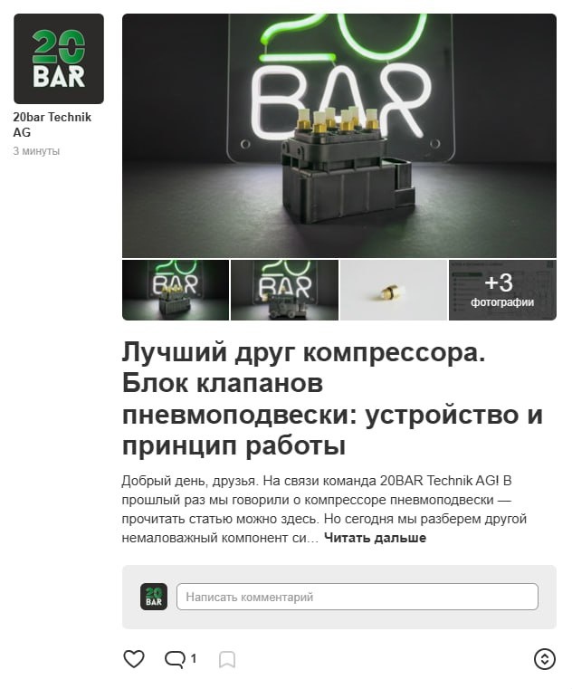 ! Если еще не успели прочитать, бегом туда — DRIVE2! Напомним, в ней мы ответили на вопросы: 1️⃣ Что такое блок клапанов? 2️⃣ Как он устроен внутри? 3️⃣За что отвечает каждый клапан? 4️⃣ Основные неисправности, с которыми сталкиваются автовладельцы? ❤️ 20BAR TECHNIK - Пневма и Точка!
