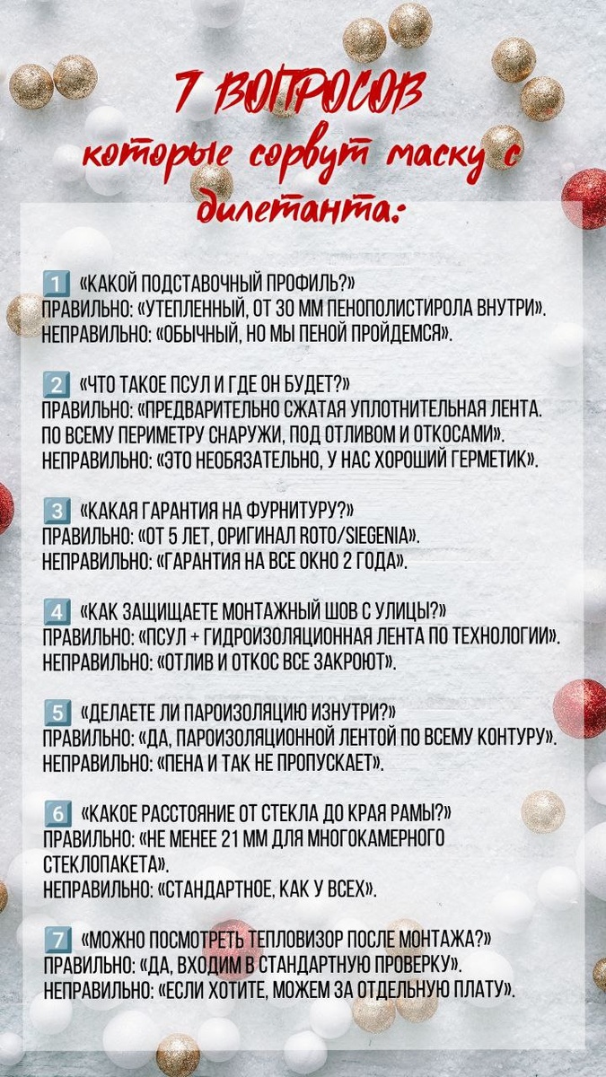 ? ❄️ Как всегда после наших разборов — полезная шпаргалка в дело. Держите чек-лист главных терминов, которые должен знать ваш монтажник, чтобы не было стыдно. 7 вопросов, которые сорвут маску с дилетанта: 1️⃣ «Какой подставочный профиль?» Правильно: «Утепленный, от 30 мм пенополистирола внутри». Неправильно: «Обычный, но мы пеной пройдемся». 2️⃣ «Что такое ПСУЛ и где он будет?» Правильно: «Предварительно сжатая уплотнительная лента. По всему периметру снаружи, под отливом и откосами». Неправильно: «Это необязательно, у нас хороший герметик». 3️⃣ «Какая гарантия на фурнитуру?» Правильно: «От 5 лет, оригинал Roto/Siegenia». Неправильно: «Гарантия на все окно 2 года». 4️⃣ «Как защищаете монтажный шов с улицы?» Правильно: «ПСУЛ + гидроизоляционная лента по технологии». Неправильно: «Отлив и откос все закроют». 5️⃣ «Делаете ли пароизоляцию изнутри?» Правильно: «Да, пароизоляционной лентой по всему контуру». Неправильно: «Пена и так не пропускает». 6️⃣ «Какое расстояние от стекл