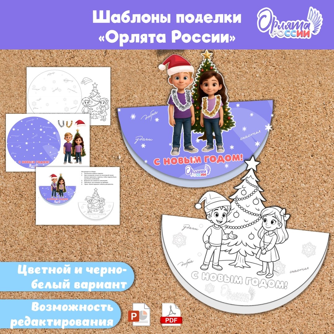 Шаблон-заготовка к аппликации «Орлята России». Новогодняя аппликация (поделка) для внеурочной деятельности «Орлята России». Материал содержит шаблоны для изготовления объемных поделок и инструкцию по их изготовлению. Можно использовать на тематических мероприятиях и внеурочных занятиях. В комплект входит: Как использовать материал: Файл в формате PDF и PPTX. Есть возможность редактирования. Каждая деталь в формате png. Можно менять размеры всех деталей.