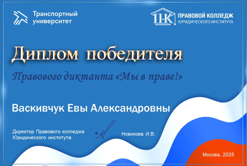 С 12 по 17 декабря 2025 года с большим успехом прошёл Правовой диктант «Мы в праве!» — знаменательное образовательное событие, по праву занявшее одно из центральных мест в череде мероприятий уходящего года. Инициатором проведения выступил Правовой колледж ЮИ РУТ (МИИТ), а к