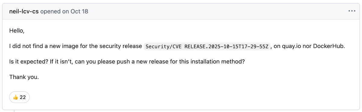 18 октября, через три дня после выхода патча, пользователи стали уточнять, будет ли опубликован соответствующий образ контейнера с обновлённым релизом на DockerHub и quay, чтобы можно было оперативно перейти на защищённую версию.