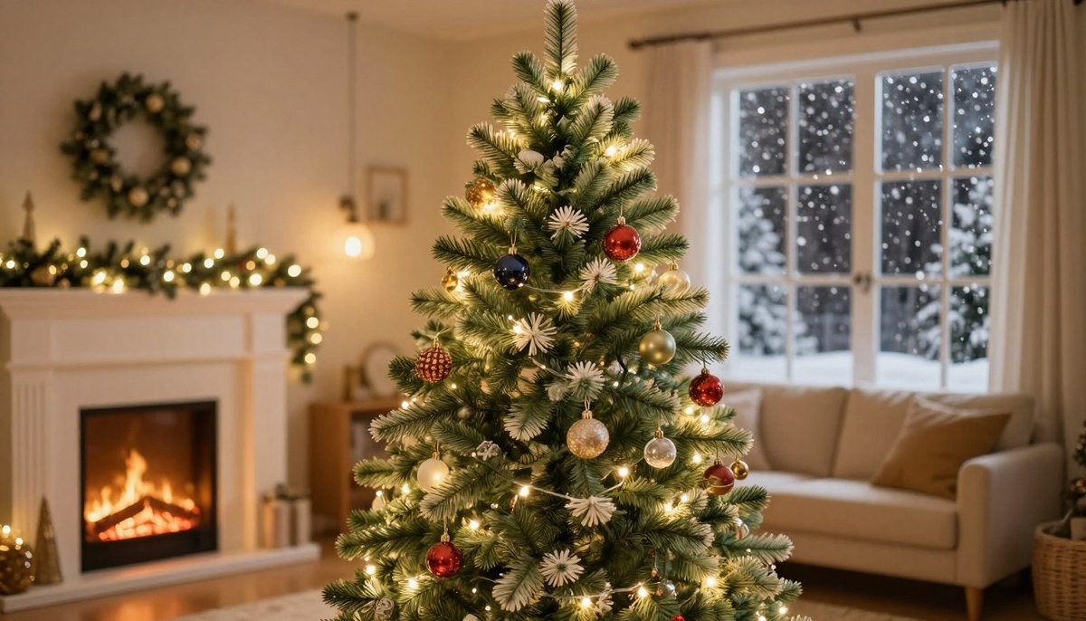 Реалистичное и детализированное изображение высококачественной искусственной рождественской елки, демонстрирующее хитросплетения веток, изготовленных методом литья под давлением. На переднем плане изображено пышное, ярко-зеленое дерево, украшенное традиционными орнаментами, мерцающими огнями и сверкающей мишурой. Центральное место занимает мягко светящаяся звезда на верхушке, освещающая елку теплым, манящим светом. На заднем плане - уютная обстановка гостиной с мягко горящим камином и праздничными украшениями, создающими радостную атмосферу праздника. Сцена снята под небольшим углом, чтобы подчеркнуть высоту дерева, при мягком, теплом освещении, отбрасывающем нежные тени, которые подчеркивают текстуру ветвей. Общее настроение создает атмосферу тепла, праздника и ощущения сезонной радости, что идеально подходит для зимнего праздника.
