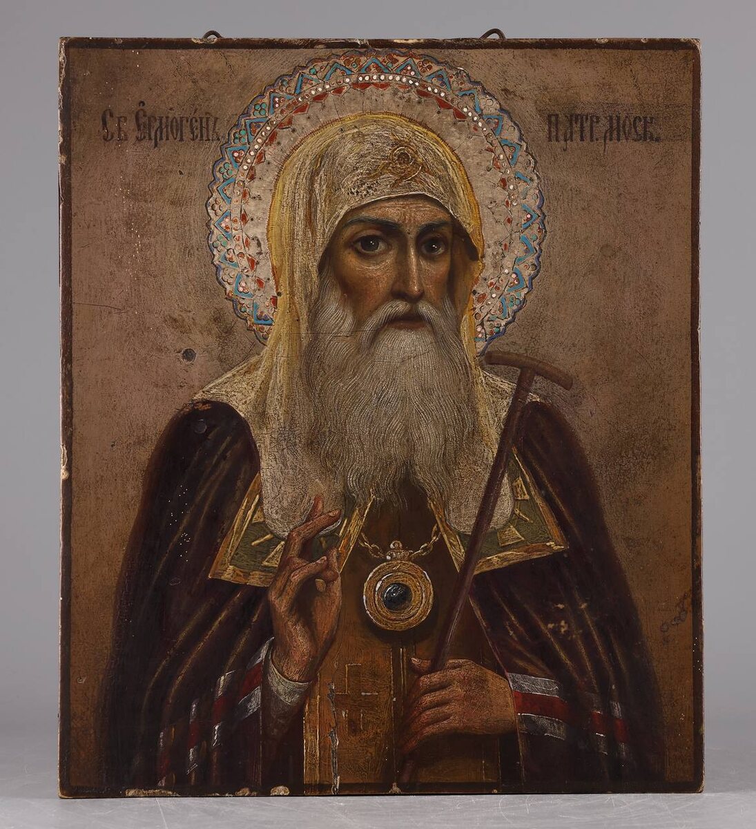 Прекрасный образ святого Ермогена Патриарха Московского в стиле модерн Материал: Дерево, масло Размер: 31,5х27 см. Возраст: XIX век Страна: Россия Сщмч. Ермоген (ок. 1530–1612), патриарх Московский и всея Руси, был выдающимся церковным и государственным деятелем Смутного времени. Начав служение священником в Казани, он стал свидетелем обретения Казанской иконы Божией Матери и составил службу в её честь. Став патриархом в 1606 году, он возглавил духовное сопротивление польско-литовским интервентам и самозванцам, рассылая грамоты с призывом защищать веру и Отечество. За свою непреклонную позицию был заключен в Чудов монастырь, где и умер от голода в 1612 году. Прославлен в лике святых в 1913 году.