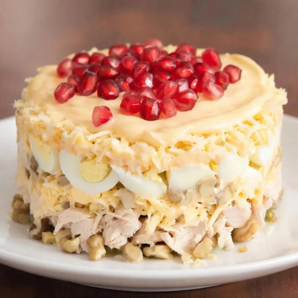 - гармоничным сочетанием текстур — нежное куриное филе, хрустящие орехи, упругие зёрна граната;