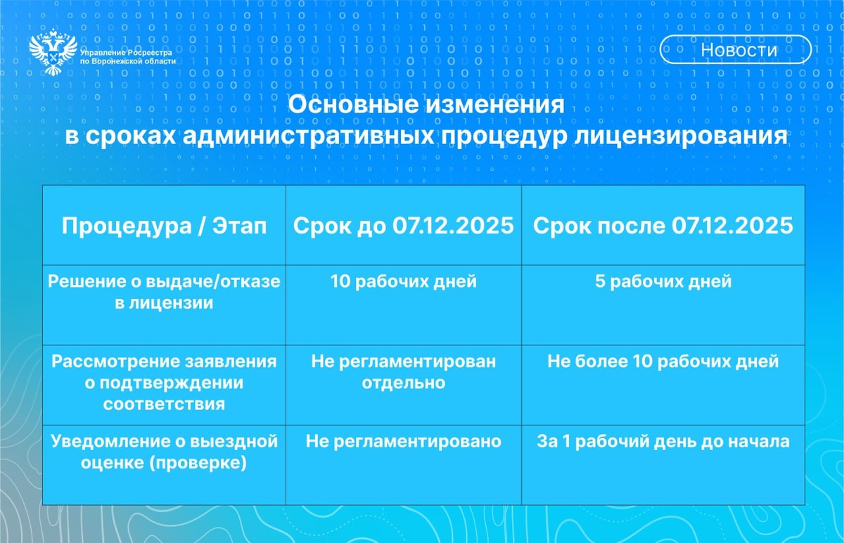 С 7 декабря 2025 года в России вступили в силу изменения в порядке лицензирования геодезической и картографической деятельности. Поправки утверждены постановлением Правительства РФ №1940 и направлены на существенное ускорение административных процедур и внедрение цифровых технологий. Что изменится: • решение о выдаче лицензии будет приниматься в 2 раза быстрее – срок рассмотрения заявления сокращается с 10 до 5 рабочих дней; • подтверждение соответствия лицензионным требованиям займет не более 10 рабочих дней; • уведомление о выездной проверке соискателю лицензии (лицензиата) будет направляется за 1 рабочий день до ее начала; • внесение изменений в реестр лицензий при отложении процедуры теперь займет не более 2 рабочих дней вместо прежних 4. Также при проведении выездных оценок лицензирующий орган будет использовать средства дистанционного взаимодействия, в том числе видео-конференц-связь или мобильное приложение «Инспектор», а перечень и содержание этих материалов будут указаны в