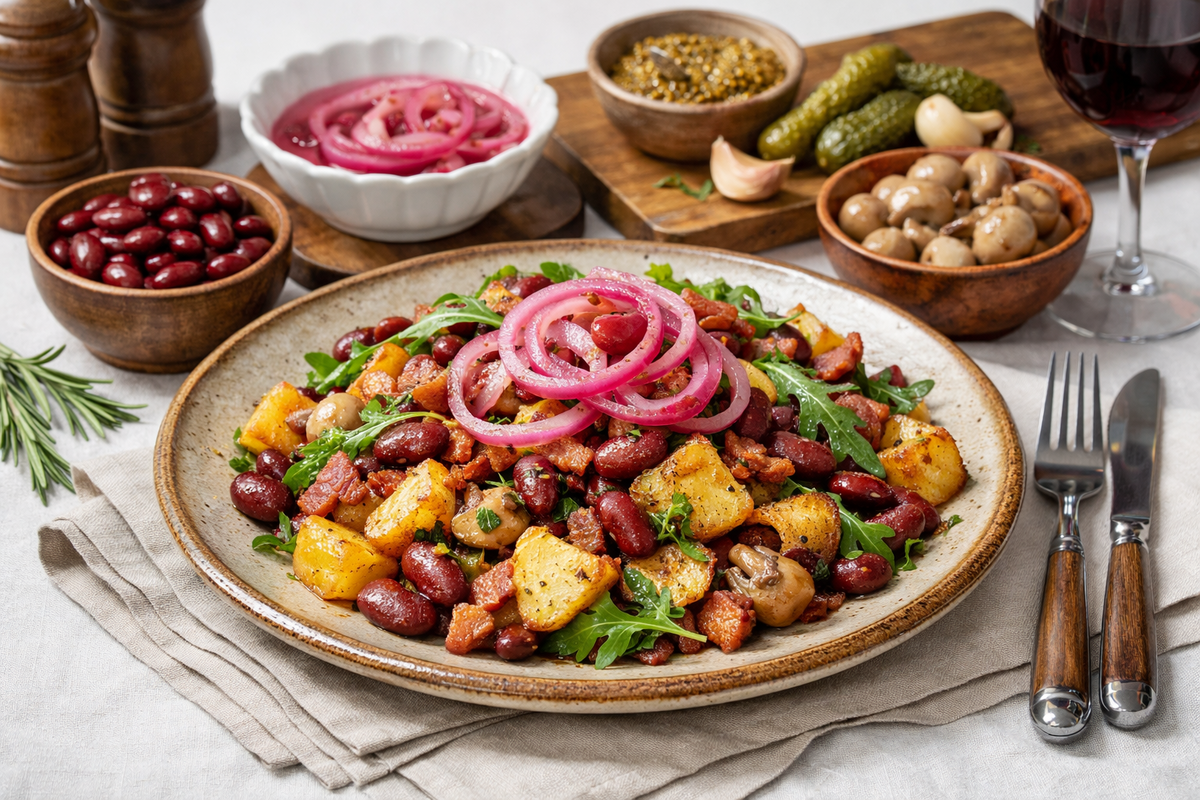 Этот салат я часто готовлю, когда хочется чего-то сытного, но не тяжёлого. Тёплый картофель, мягкая фасоль и кисло-сладкий маринованный лук собираются в блюдо, которое выглядит празднично, а готовится из самых простых продуктов. Отличный вариант и для семейного ужина, и для красивой подачи на стол.