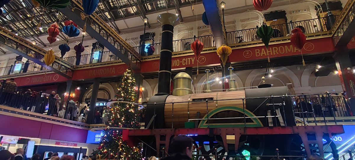В Петербурге декабрь всегда начинается одинаково: город ещё без снега, но уже очень хочется новогоднего настроения. В прошедшие выходные мы как раз были в таком состоянии — и решили искать праздник не на улице, а под крышей. Снова «на разведку» отправился Алексей, а я, как обычно, аккуратно собрала его впечатления в один текст. На этот раз маршрут привёл нас в Vokzal 1853 — самый большой фудмолл в России, находится он на набережной Обводного канала, 118С, совсем рядом с метро «Балтийская». Удобное расположение, большая парковка, уже на старте плюс, особенно если хочется выбраться всей семьёй. «Vokzal 1853» — это большое, светлое и действительно красивое пространство. Здесь много воздуха, уровней, света и ощущение, что ты не просто в ТЦ, а в каком-то городском пространстве для отдыха. На первом этаже сразу встречает огромная новогодняя ёлка. Высокая, нарядная, с гирляндами, игрушками и звездой. Но главный сюрприз — железная дорога. Причём не одна: вокруг ёлки проложены сразу три мини-пу