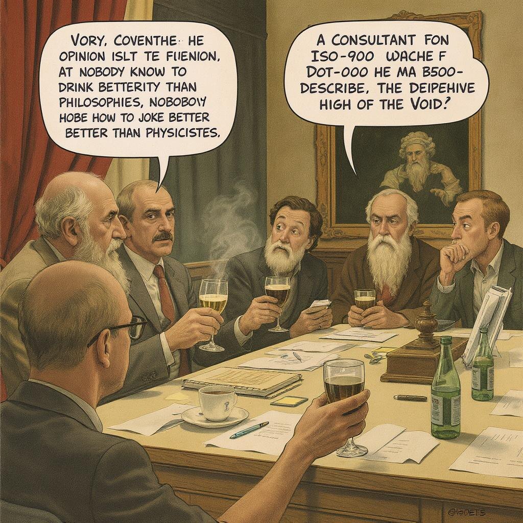 Друзья, в МГУ им М.В. Ломоносова бытует мнение, что лучше философов никто пить не умеет, а лучше физиков никто шутить не умеет. Мы не согласны. Нет, конечно философы пить умеют, но и здорово шутить тоже могут, просто их юмор очень высок и абстрактен. Вот например как консультант по ISO-9000 описал бы процесс Дотворения, когда бы был нанят для этой работы единством Полноты и Пустоты. Если вас заинтересовал такой подход, наши коллеги - сертифицированные менеджеры по управлению качеством. Любые ваши идеи отсертифицируют дешево и сердито. Вы же догадались какие у них "особые" клиенты.