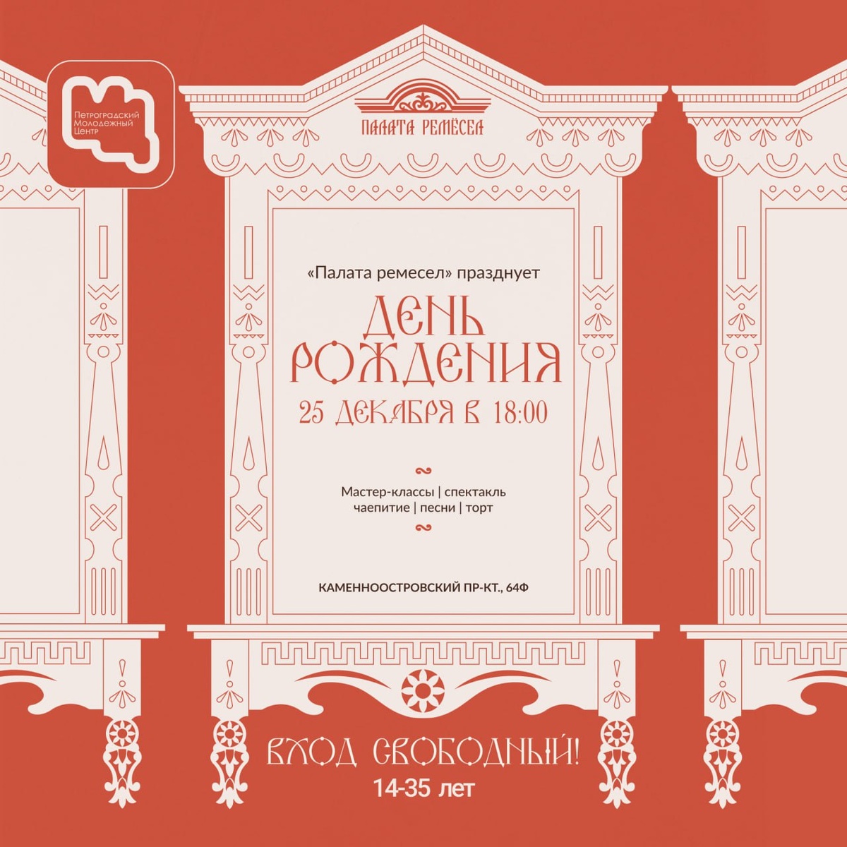 ! 🎉 Уже целых пять лет «Палата ремесел» сохраняет народную культуру и популяризирует ее среди молодежи. Приглашаем отпраздновать этот теплый и душевный юбилей вместе. Вас ждет особая праздничная программа: творческие мастер-классы, живая музыка, спектакль и, конечно же, именинный торт! Давайте вместе создадим виртуальный альбом наших лучших моментов! Выкладывайте в соцсетях свои фотографии, истории и самые теплые воспоминания о пространстве с хештегом #5летПалатеРемесел. Расскажите, чем для вас стала «Палата ремесел»? Пусть наш праздник будет еще теплее! ❤️ 📅 25 декабря (четверг) в 18:00 📍 Каменноостровский пр-кт., 64Ф, МП «Палата ремесел» 📌 Обязательна регистрация на двух ресурсах: clck.ru/3Qsvvg и clck.ru/3Qsvxz Мероприятие для лиц 14-35 лет. Не забудьте взять сменную обувь!