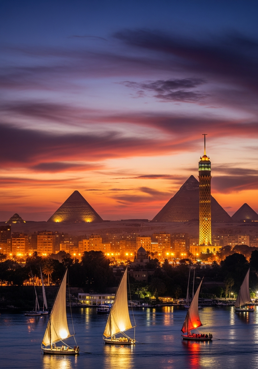 Романтическая прогулка по великой реке — лучший способ увидеть Каир в огнях ночной иллюминации. Двухчасовое путешествие на роскошном корабле сочетает изысканный ужин, панорамные виды и яркое фольклорное представление.