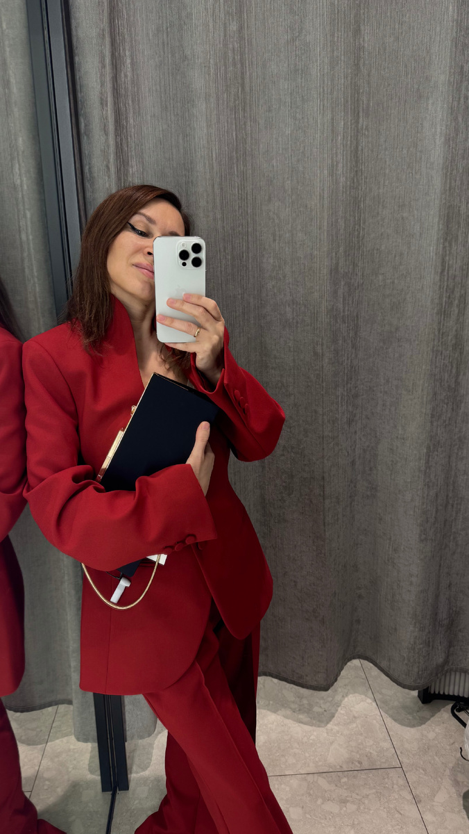 Lime снова порадовал своими новинками.И я с удовольствием делюсь с вами своими фаворитами и идеями сочетаний. Признаться, раньше я избегала ярких красных оттенков в одежде, считая их слишком броскими. Однако в последнее время мое отношение к этому цвету изменилось,и теперь я охотно включаю его в свои образы. Костюм состоит из двух частей, каждая из которых заслуживает внимания: Жакет с четкими линиями и структурированными плечами идеально сочетает деловую строгость и женственность. Для неформального образа можно надеть под него тонкий шелковый топ цвета слоновой кости или черный кружевной бралетт. На мне жакет размера М, и он мне немного великоват.Широкие брюки придают силуэту расслабленность, сохраняя элегантность. Я почувствовала себя комфортно и стильно одновременно. Чёрный шёлковый клатч на изящной цепочке стал ярким акцентом в образе. Он не только практичен, но и выглядит очень стильно. Контраст между чёрным и красным создал изысканный и завораживающий аутфит. Этот образ, кото