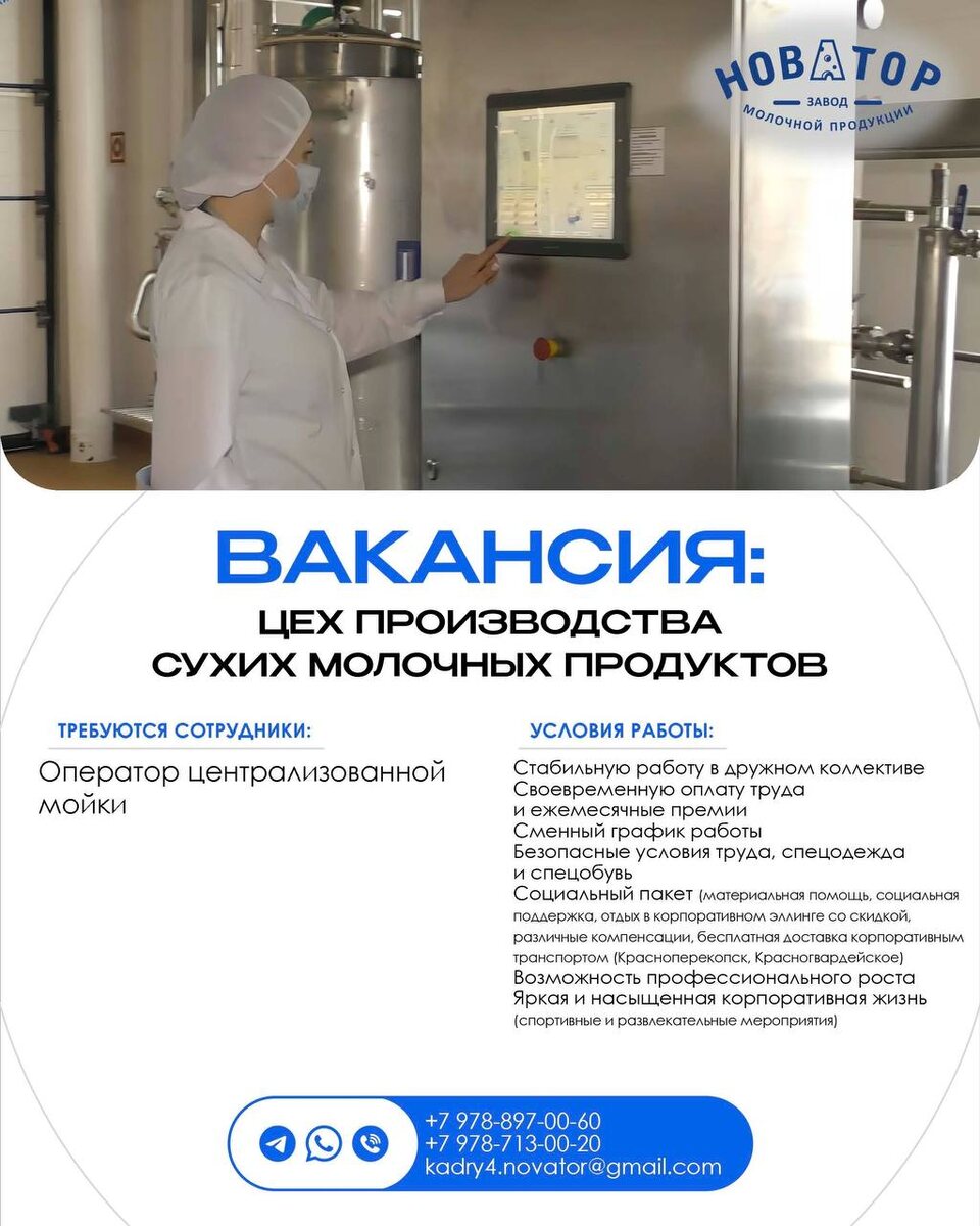 персонала более 1500 сотрудников. ПРИГЛАШАЕМ КАНДИДАТОВ НА ПОЗИЦИЮ «Оператор централизованной мойки». Зарплата от 60 000 рублей. !!ОБУЧАЕМ С НУЛЯ!! МЫ ПРЕДЛАГАЕМ: 1. Работа в крупной, стабильной и динамично развивающейся компании, сменный график работы. 2. Комфортные места работы с комнатами для приёма пищи. 3. Конкурентоспособная заработная плата, регулярная индексация оклада, премии по результатам работы, возможность влиять на свой результат. 4. Социальный пакет (материальная помощь, социальная поддержка, отдых в корпоративном эллинге со скидкой, различные компенсации, бесплатная доставка корпоративным транспортом (Красноперекопск, Красногвардейское). 5. Яркая и насыщенная корпоративная жизнь: спортивные и развлекательные мероприятия. ВАМ ПРЕДСТОИТ: Принимать моющие и дезинфицирующие средства. Изготавливать моющие и дезинфицирующие растворы требуемых концентраций. Вести процесс мойки технологического оборудования Соблюдение стандартов предприятия. ЖДЕМ ВАШ ОТКЛИК! (или приезжайте