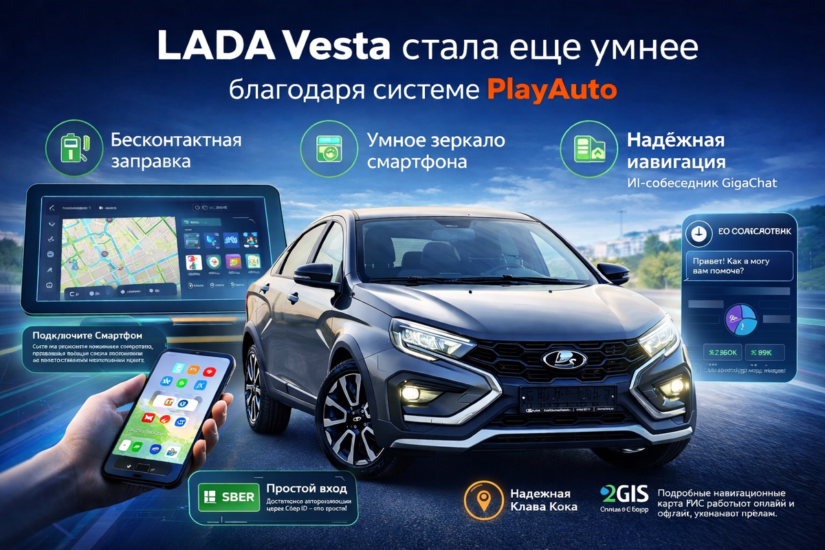 LADA Vesta стала еще умнее благодаря новой мультимедийной системе PlayAuto. Это целая экосистема услуг, где бесконтактная заправка — лишь одна из многих функций.