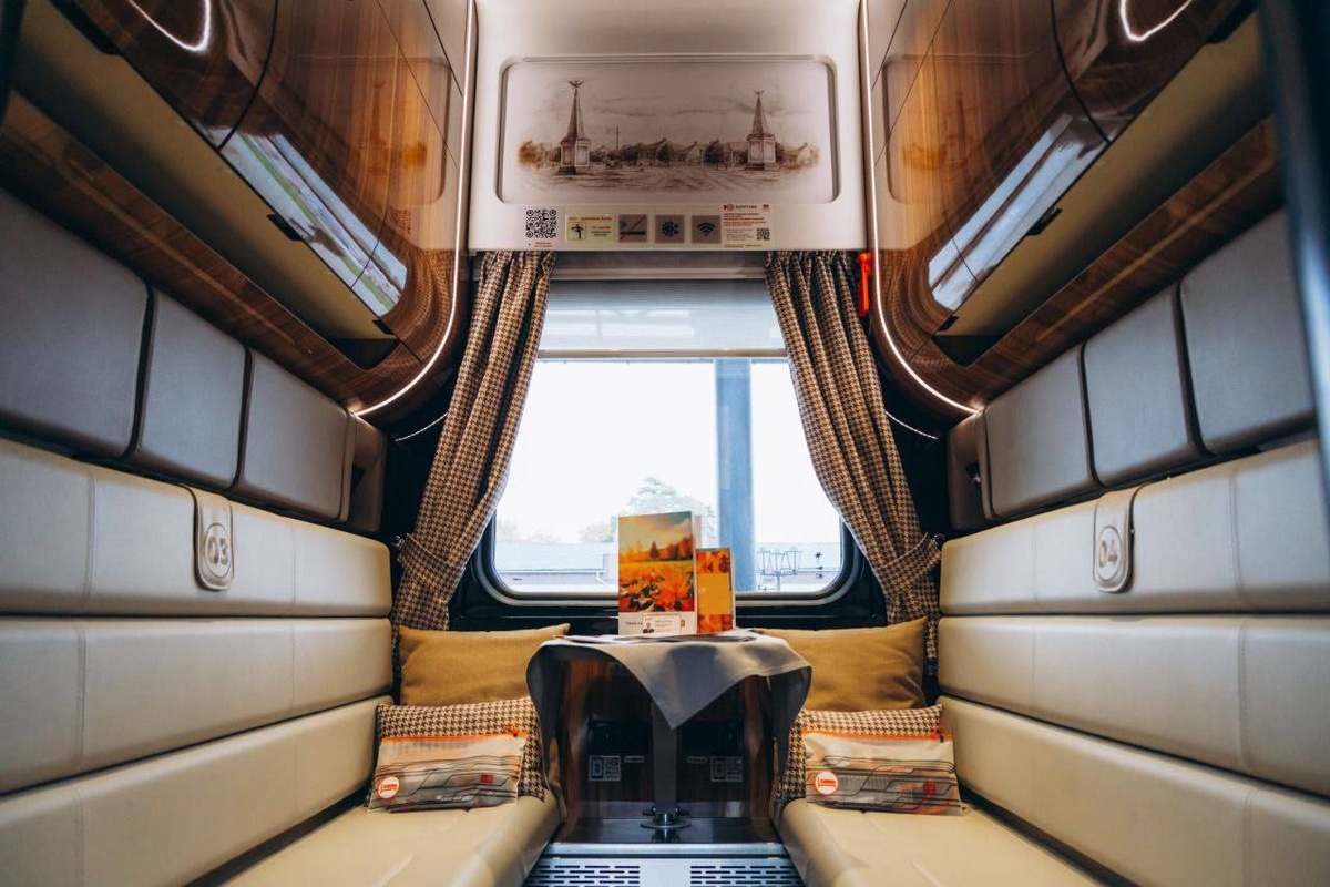 На железной дороге начали курсировать новые вагоны повышенной комфортности. Каждый вагон оснащён 8 купе с двухметровыми спальными местами. Кроме того, имеются отдельные душевые комнаты, а также фен, утюг и гладильная доска для удобства пассажиров. Кроме того, купе оснащены следующими удобствами: • Настраиваемое освещение; • Вместительные закрытые полки для ручной клади; •Ниши для верхней одежды; • Мультимедийные экраны; * Индивидуальные светильники; • Розетки и USB-разъёмы; • Кнопка вызова проводника.