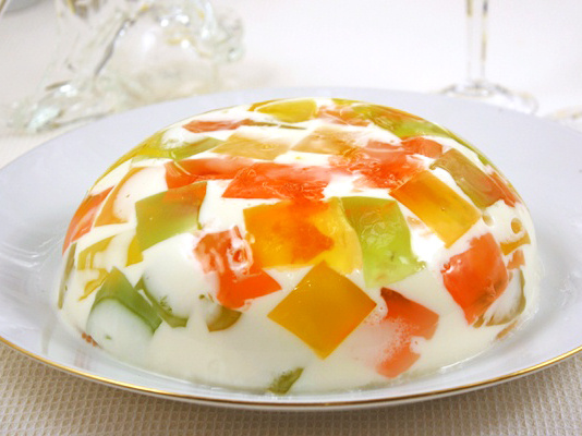 Холодный, яркий, красивый и очень вкусный торт, который мы готовили ещё в нашем детстве и называется он "Битое стекло". Торт удобно готовить заранее, он хорошо стоит в холодильнике и всегда выглядит как праздник, даже без лишнего декора. Полный список ингредиентов - в конце⤵ Сначала занимаемся желе. Берем 3 пачки желе разных цветов и разводим каждую по инструкции, но воды берем меньше - вместо 400 мл используем 200-300 мл. Так желе получается плотным и уверенно держит форму. Разливаем по мискам и убираем в холодильник до полного застывания. Готовое желе вынимаем, опуская миски на 3-4 секунды в горячую воду, и нарезаем кубиками среднего размера. Слишком мелко не нужно - на разрезе должен быть рисунок. Больше фото смотрите тут: Теперь готовим связующую основу. Берем 25 г быстрорастворимого желатина и заливаем его стаканом горячей воды температурой около 60-70 градусов. Размешиваем до полного растворения и оставляем слегка остыть. В миске соединяем 400 г сметаны жирностью 15-20 процентов,