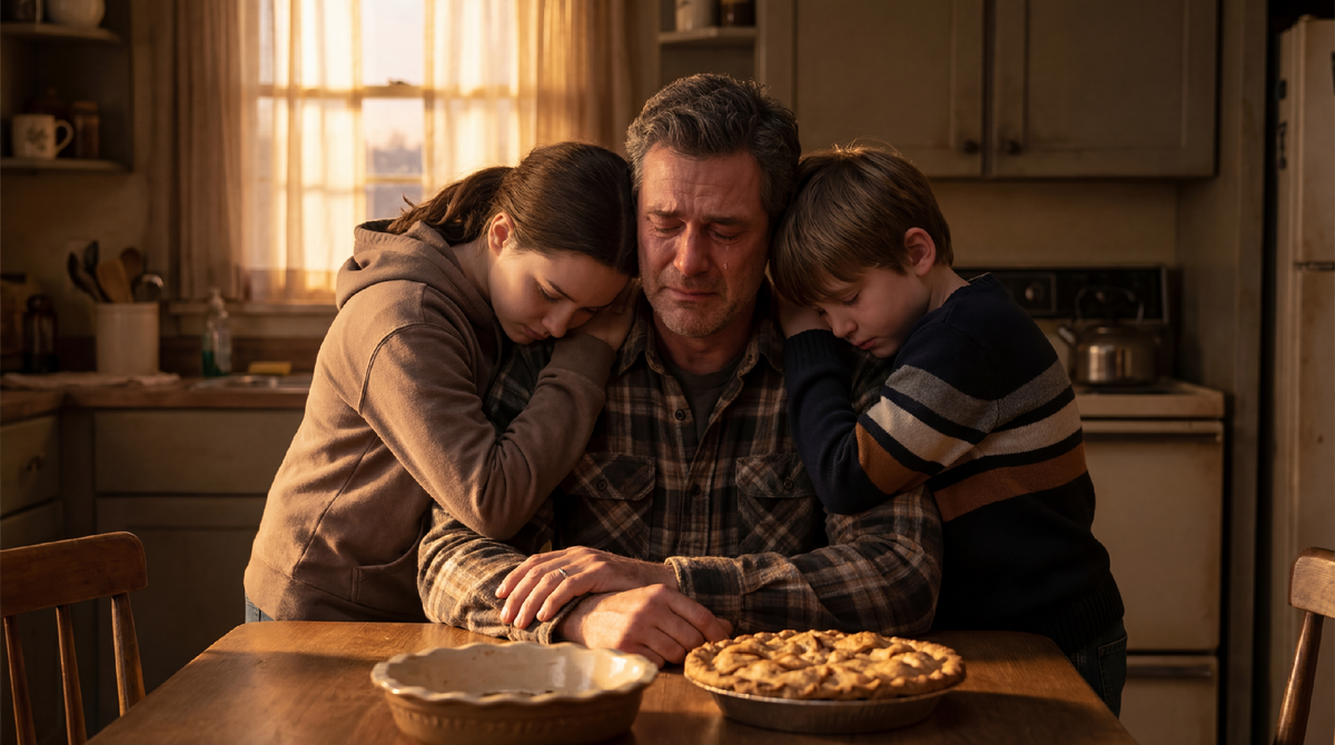 Она села за стол молча. Взяла кусок пирога. Откусила. Лицо её дрогнуло.