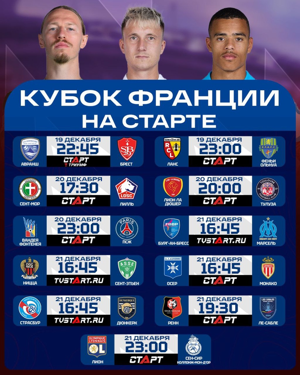 ! Здесь все: «ПСЖ» Сафонова, «Монако» Головина и Погба, «Марсель» Гринвуда, в общем, весь цвет французского футбола. 11 матчей 1/32 финала национального Кубка на любой вкус. Смотрим весь уик-энд на телеканалах «Старт» и платформе TVSTART.RU 🖥 🛒 Наше приложение в Google Play 💙 Наше приложение в RuStore 🛒 Наше приложение в App Store