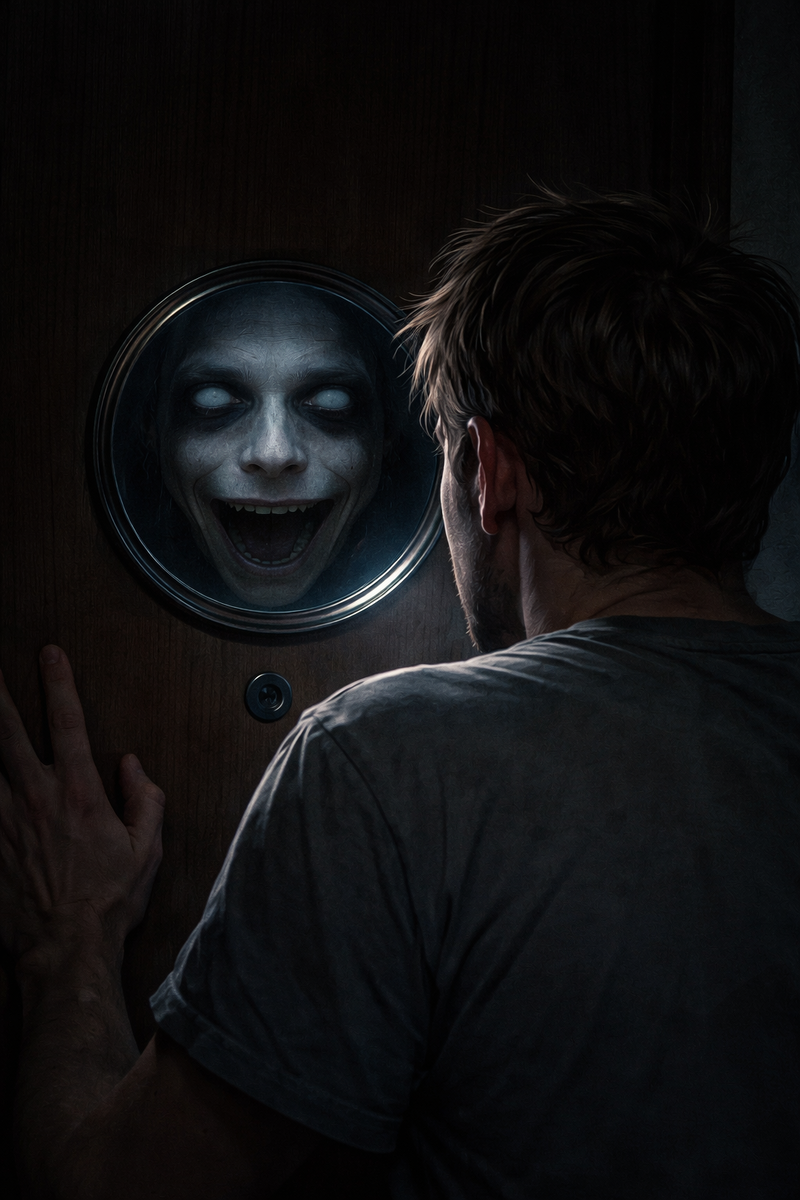 Он подошёл к глазку после очередного звонка и увидел… не площадку. Точнее, площадка была, но занимала странно мало места, будто отодвинулась назад. Почти весь круг был заполнен размытым серым пятном — как ткань, как кожа, как туман, прижатый вплотную.
