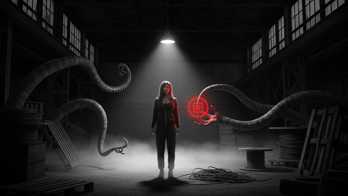 Грета пересекла несколько улиц и свернула в старый промышленный район. Фонари едва работали, поэтому я следовала за ней сквозь тени, пока она не подошла к старому складу. Она остановилась у тяжёлой, ржавой двери. Я спряталась за припаркованным грузовиком.