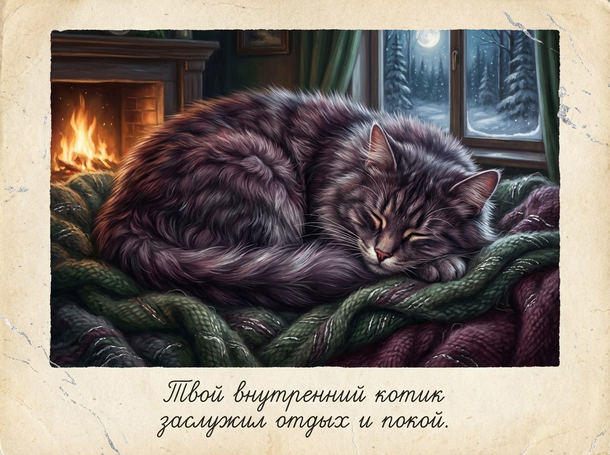 Твой внутренний котик заслужил отдых и покой после долгой прогулки по тропинкам уходящего дня. Пусть все тревожные мысли, словно назойливые мухи, улетят прочь, а сердце наполнится тихим, тёплым мурчанием. Завтра будет новый рассвет, новые крыши для исследований и новые солнечные зайчики для игр. А сейчас — время для самого уютного гнездышка, где тебя укроет бархатная пелена снов. Почувствуй, как расслабляется каждая мышца, как дыхание становится ровным и глубоким, убаюкивая тебя. Ты в безопасности, ты в тепле, и впереди тебя ждёт волшебная ночь.