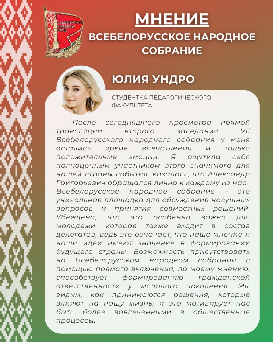 🔴Студентка педагогического факультета ВГУ имени П.М. Машерова Юлия Ундро о Послании Президента Республики Беларусь А.Г. Лукашенко на VII ВНС — После сегодняшнего просмотра прямой трансляции Второго заседания VII Всебелорусского народного собрания у меня остались яркие впечатления и только положительные эмоции. Я ощутила себя полноценным участником этого значимого для нашей страны события, казалось, что Александр Григорьевич обращался лично к каждому из нас. Всебелорусское народное собрание – это уникальная площадка для обсуждения насущных вопросов и принятия совместных решений. Убеждена, что это особенно важно для молодежи, которая также входит в состав делегатов, ведь это означает, что наше мнение и наши идеи имеют значение в формировании будущего страны. Возможность присутствовать на Всебелорусском народном собрании с помощью прямого включения, по моему мнению, способствует формированию гражданской ответственности у молодого поколения. Мы видим, как принимаются решения, которые в