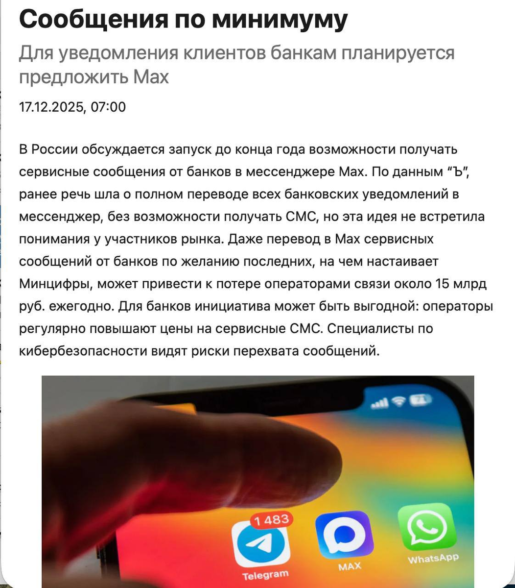 В СМИ появилась информация о планах Минцифры перевести все сервисные сообщения от банков в государственный мессенджер MAX. Разбираемся, что это значит для пользователей и рынка. По данным источников, рассматривается вариант: Государство (Минцифры): Банки (потенциально): Сотовые операторы: Киберэксперты: Если инициативу примут, возможны сценарии: Итог: