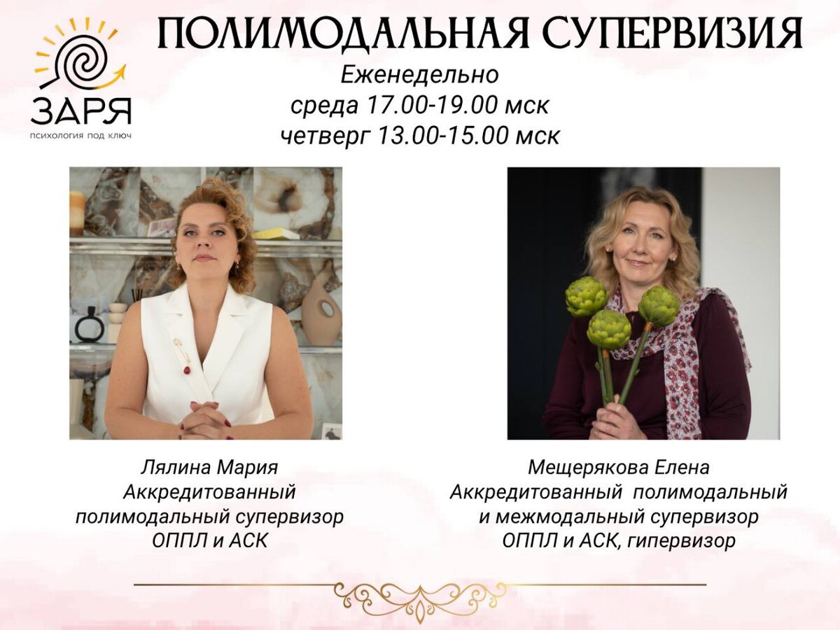 Ошибки и трудности, возникающие в процессе работы рискуют стать закономерными и системными, если вовремя не обратиться за помощью к профессионалам. В супервизиях мы учимся не только лучше, эффективнее работать, они также становятся для нас значимым источником получения необходимой профессиональной поддержки. Это особенно ценно для начинающих терапевтов, так как супервизорская поддержка позволяет терапевту разделить ответственность с супервизором за отдельные аспекты работы с клиентами. Полимодальная супервизия регулярная абонементная группа каждую среду с 17:00-19:00 мск и четверг с 13:00 -15:00 мск. 800 р. / час Абонемент 4 часа - 2200 (550 р час) 1 мес 14 час- 7000 (500 р /час) 4 мес 20 час - 9600 (480 р/час) 6 мес 30 час - 13500 ( 450 р/час) 9 мес 50 час – 21500 (430 р/час) 12 мес 75 час 30750 (410 р/час) 18 мес 100 час 39000 (390 р/час) 24 мес По вопросам пишите организатору Элеоноре +79026170617