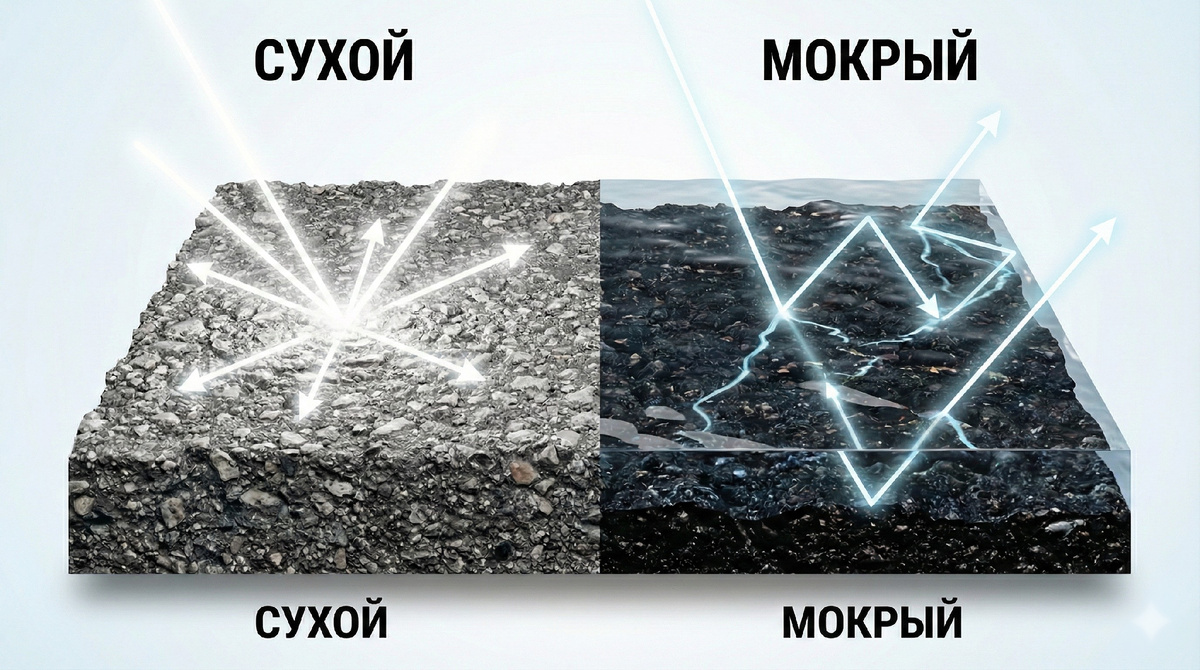 Почему мокрый асфальт становится черным, если вода прозрачная?