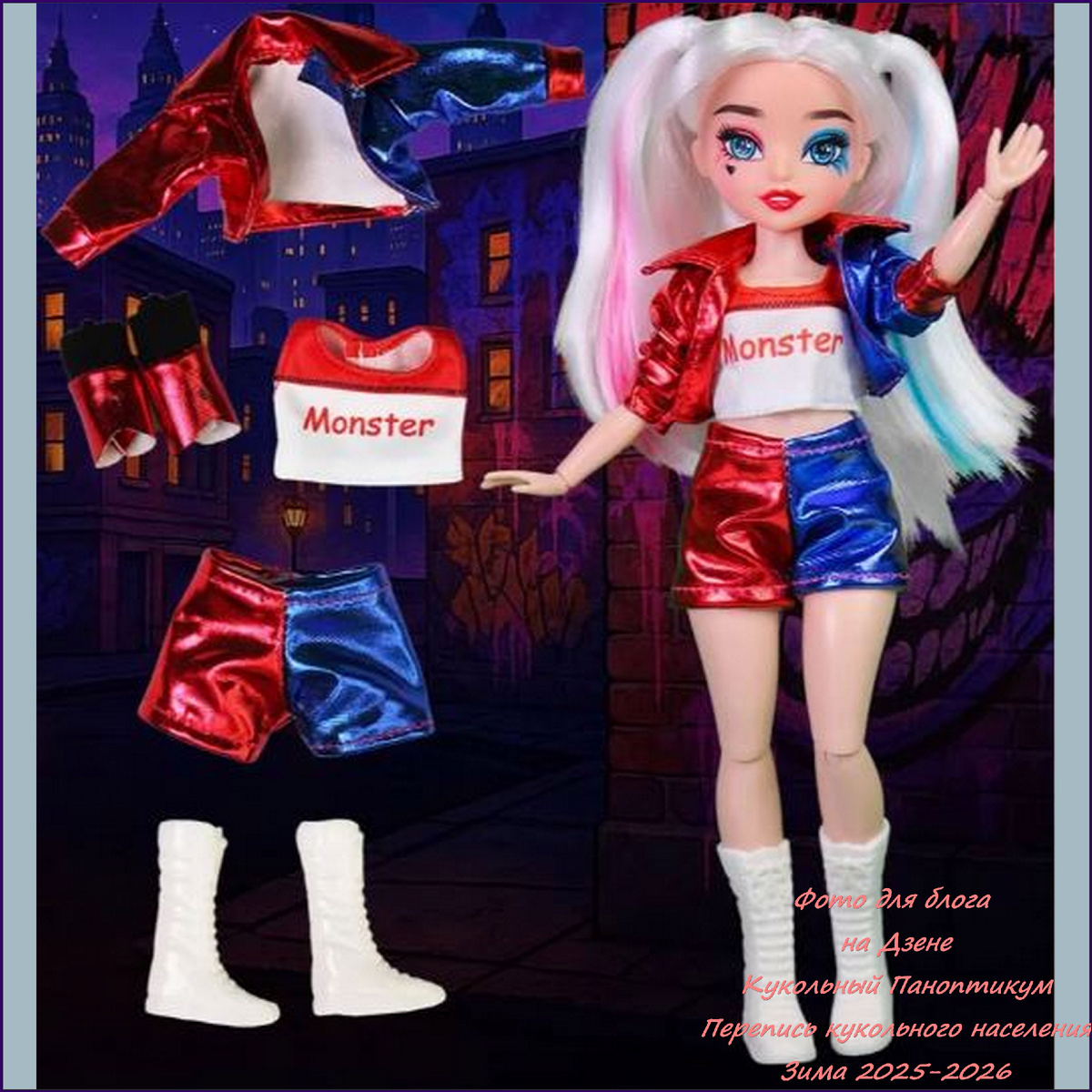 Здравствуйте, мои кукольные эстеты! Эрика из Кукольного Паноптикума снова с вами, и сегодня мы погрузимся в мир глэм-рока и сумасшедшего очарования! 1) Харли Квин от Glam Core – это современный стиль, сочетающий в себе элементы глэм-рока, панка и поп-культуры. Он характеризуется яркими цветами, блестками, необычными аксессуарами и бунтарским духом. Glam Core – это смелое самовыражение и протест против серых будней. Харли Квинн (Harley Quinn) – персонаж комиксов DC Comics, созданный Полом Дини и Брюсом Тиммом. Впервые она появилась в мультсериале "Бэтмен" в 1992 году. Харли – бывший психиатр Аркхемской лечебницы, влюбившаяся в Джокера и ставшая его верной помощницей. Её образ – это смесь безумия, юмора и сексуальности. Харли Квинн быстро завоевала популярность и стала одним из самых узнаваемых персонажей DC Comics. Кукла Glam Core Харли Квинн: Внешность: У куклы светлые (платиновые) волосы, собранные в два высоких хвостика, с цветными прядями (розовыми и голубыми). На лице – характерный