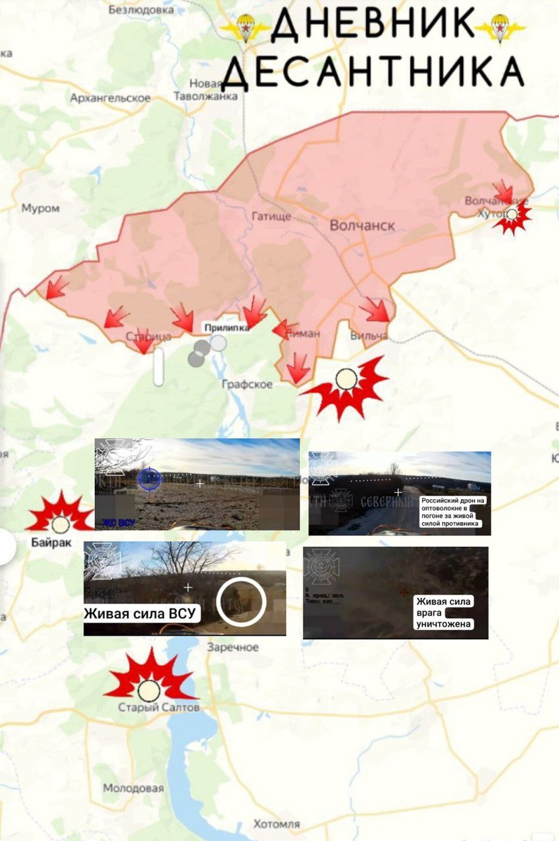 Докладывает Добрый 🫡 В населенных пунктах и лесных массивах прилигающих к Волчанску продолжаются ожесточенные бои, также сообщается о боях в районе Меловое - Хатнее. В районах населенных пунктов Старый Салтов, Волчанские Хутора и Великий Бурлук ВС РФ разгромили формирования пяти бригад ВСУ. 🔥 В районе н.п Байрак Харьковской области бойцы 244 бригады с помощью дрона на оптоволокне организовали засаду пехоте врага. 🔥 Под Волчанском ударом FPV-дрона уничтожен автомобиль 58 омпбр ВСУ, в котором находился заместитель командира роты БПЛА бригады и несколько операторов FPV противника. ▫️ В населенном пункте Волчанские Хутора продвигаясь наши бойцы расширяют зону контроля взяв несколько опорников и закрепившись на двух участках. Южнее Волчанска идут бои в населенном пункте Вильча. В ходе боёв наши бойцы продвигаются и занимают здания зачищая их. В районе населенного пункта Прилипка давим противника расширяя зону контроля территории. Продвигаясь заняли несколько домов. В районе населе