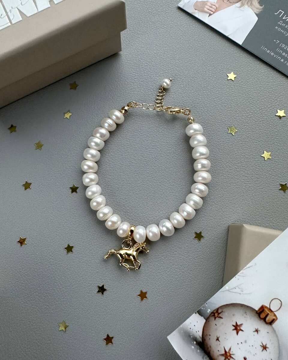 Браслет из натурального жемчуга с символом года Лошади - нежное украшение, которое принесет удачу в Новом году