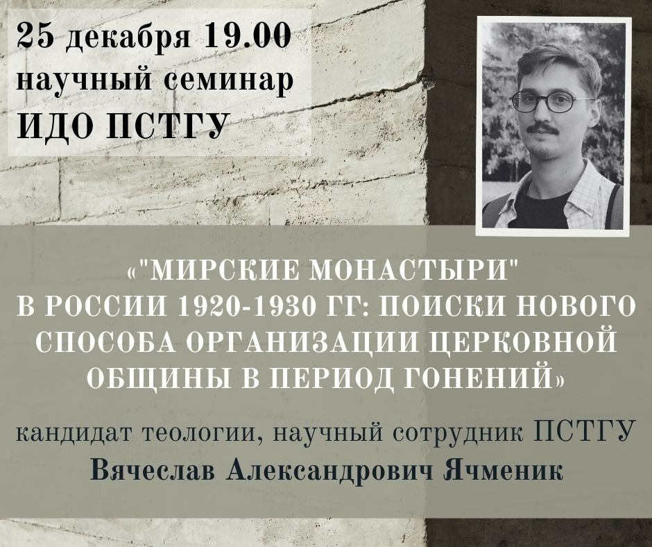 25 декабря 2025 года в 19.00 в Институте дистанционного образования ПСТГУ пройдет научный семинар «"Мирские монастыри" в России 1920-1930 гг: поиски нового способа организации церковной общины в период гонений», на котором выступит кандидат теологии, научный сотрудник Лаборатории исследований церковных институций ПСТГУ Вячеслав Александрович Ячменик.