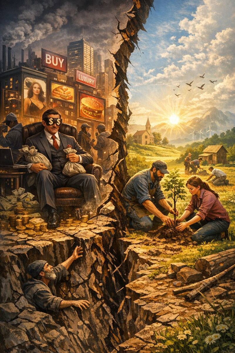 Из недавних размышлений ,наблюдений и анализа пропущенных через GPT . Общество потребления — это общество утраты чести Общество потребления состоит не из вещей. Оно состоит из людей, которые разучились отдавать. Их не интересует труд как вклад. Их интересует результат без усилия, доход без ответственности, удовольствие без последствий. Это мышление взять и уйти. Взять у земли — и не восстановить. Взять у людей — и не быть благодарным. Взять у жизни — и ничего не вернуть. Это не случайность. Это форма духовного воровства: пользоваться тем, что создано другими, не имея намерения создавать самому. В таком обществе труд презирают, служение считают слабостью, а совесть — невыгодным ограничением. Человек больше не спрашивает: чем я могу быть полезен? Он спрашивает: как мне получить больше, делая меньше? Предательство здесь — норма. Предают идеалы ради комфорта. Предают путь ради быстрого успеха. Предают самих себя, меняя глубину на удобство. И самое опасное — это общество не выгл