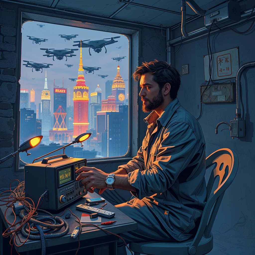 Он настроил частоту — и в этот миг понял: они не смогут заглушить его сигнал. В Метрополии‑9 радиочастоты давно стали ресурсом. Их контролировали: Марк Т‑417 работал техником в Департаменте спектрального надзора. Его задача — выявлять и глушить «несанкционированные эфиры»: подпольные радиостанции, самодельные передатчики, «заражённые» частоты. — Ты делаешь мир стабильнее, — повторял куратор. — Меньше волн — меньше хаоса. Но каждую ночь Марк спускался в заброшенный подвал и собирал собственный передатчик. Всё изменилось в день планового сканирования. Имплант‑анализатор вдруг выдал: «Спектральная нестабильность: 91 %. Риск распространения „заразных сигналов“. Протокол 17.4». Его Меди‑код сменился на жёлтый. На запястье появился браслет с мигающим кодом. — Это ошибка! — крикнул он. Инспектор даже не поднял глаз:
