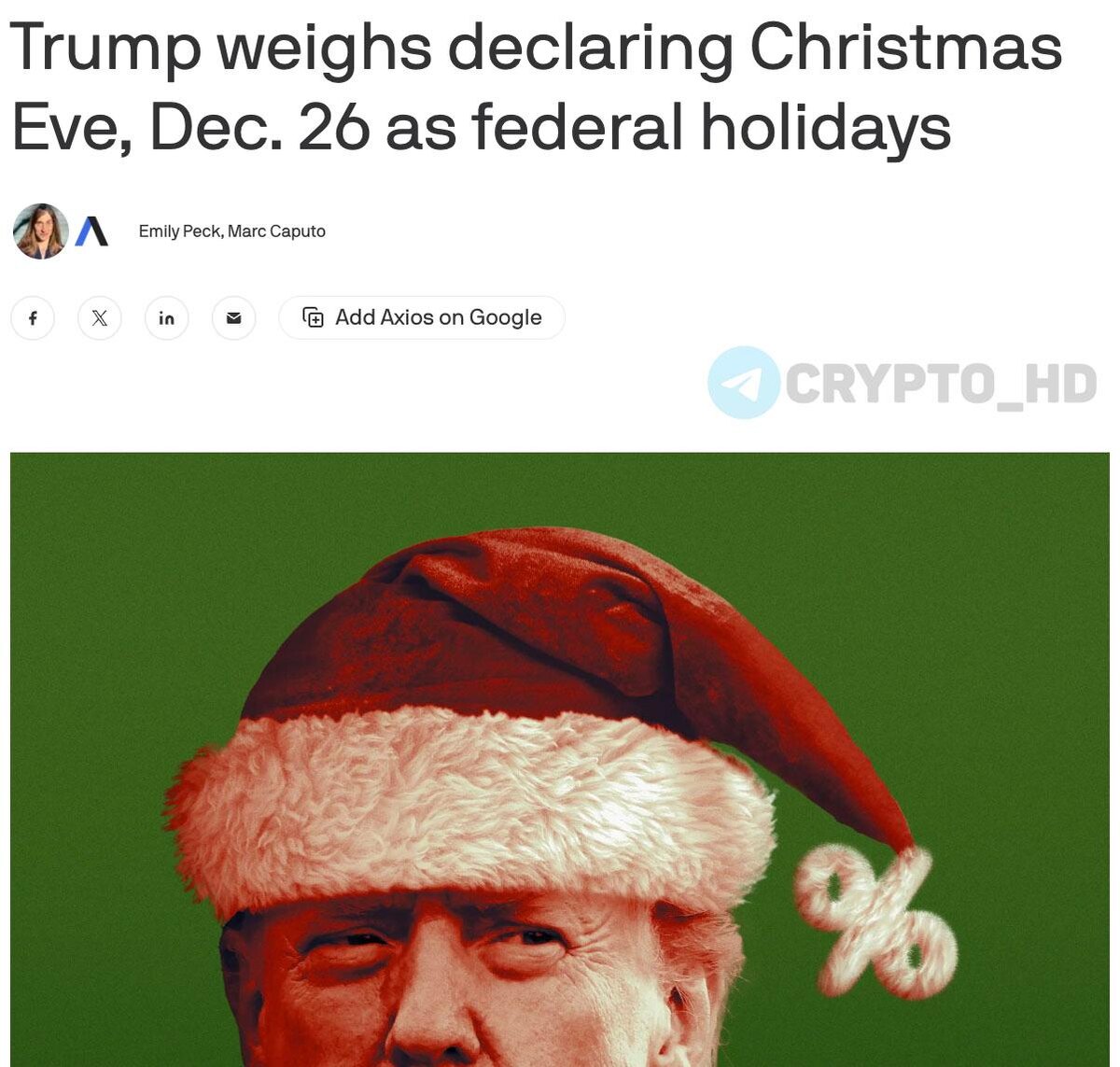 🇺🇸 Axios: Дональд Трамп собирается объявить 24 и 26 декабря федеральными выходными днями – в Белом доме ведутся обсуждения.