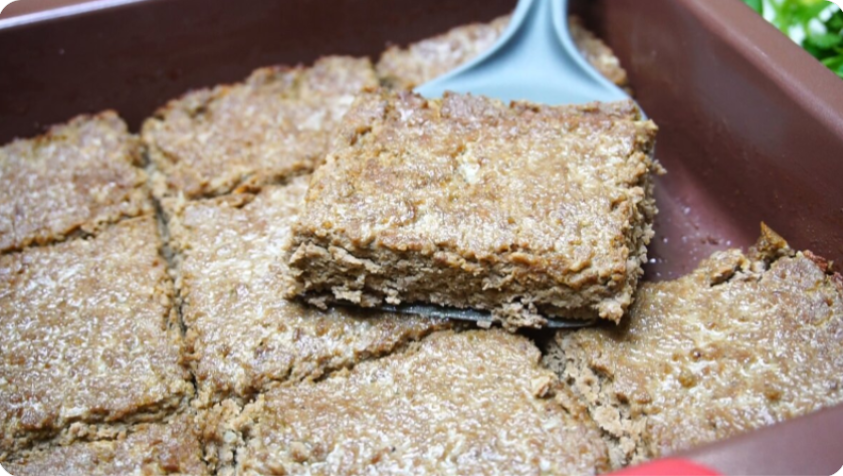 Теперь сразу смазываем хорошо сливочным маслом и разрезаем на порционные кусочки.