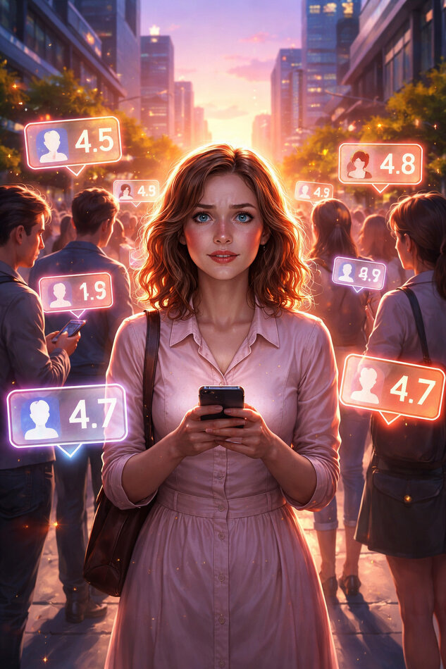 Не спецэффектами и не сюжетными поворотами, а тем, насколько точно она передаёт то, что мы часто не замечаем в повседневной жизни. В фильме изображена действительность, в которой каждое твое действие кто-то оценивает, и от этих оценок зависит вся твоя жизнь. Как ты улыбнулась? Что ты сказала? Как посмотрела? Твой средний балл решает все. Где ты живешь? Какие услуги получаешь? И как с тобой разговаривают окружающие? Многие люди уже так живут только без цифрового счётчика над головой. Главная героиня Лэйси старается быть идеальной. Она улыбается чуть дольше, чем нужно. Говорит слащавым голоском даже тогда, когда внутри нарастает раздражение. Контролирует каждую реакцию, каждое движение, каждое слово. Напряжение растёт, но замедлиться нельзя. Одна ошибка- и рейтинг снижается, а вместе с ним начинает разрушаться привычная жизнь. С психологической точки зрения это существование, целиком построенное на внешне