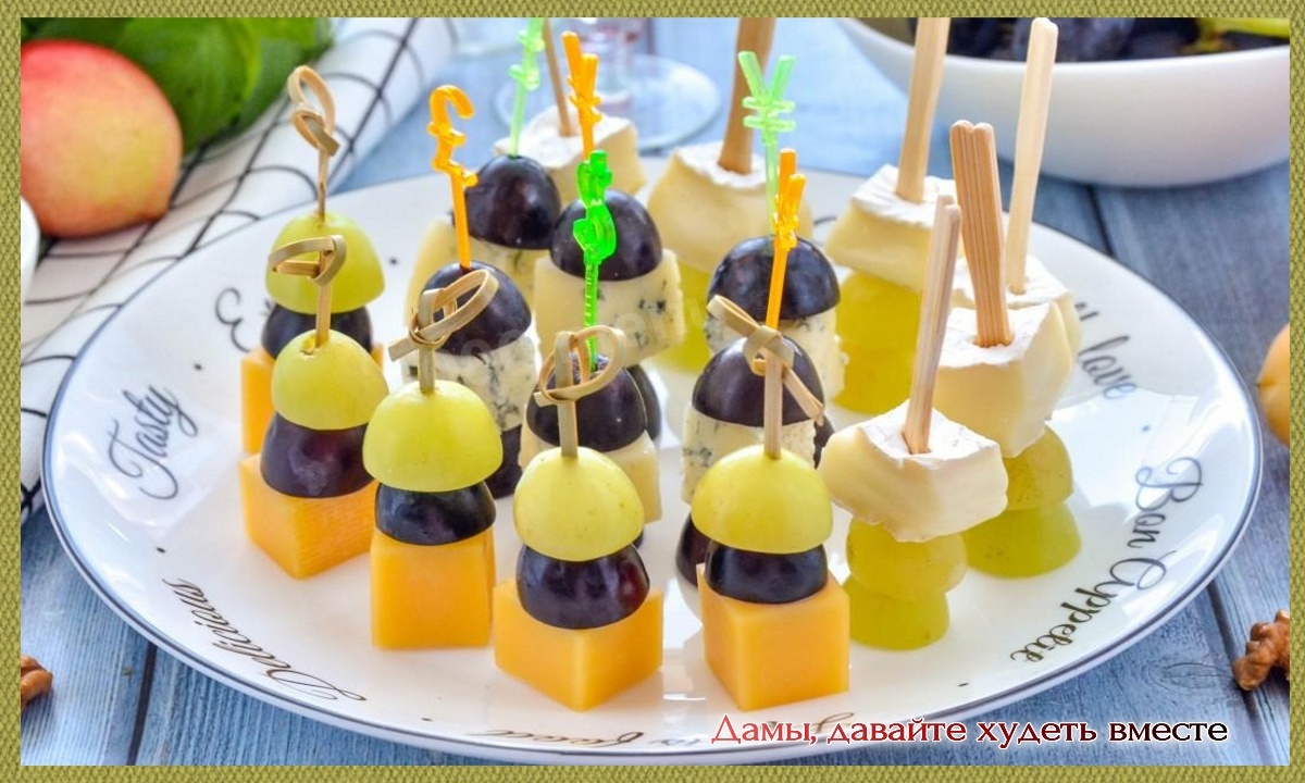 Доброго всем дня, милые дамы! Новый год приближается к нам просто семимильными шагами. Как же быстро мчится Время! Я уже ворошу свою тетрадь с пп-рецептами: так привыкли с мужем есть правильную пищу, что хочется и на праздничном застолье видеть пп-блюда. Начинаю делиться рецептами, на которые уже "положила глаз". Сегодня - рецепты канапе. -------------------------------- Самые ходовые в нашей семье - это "Трио на шпажках". На картинке - фото из интернета. Ингредиенты: Приготовление" 1. сыр нарезаем кубиком. 2. Нанизаем на шпажки маслину, сыр, виноград - именно в такой последовательности: будет и красиво, и не разберётся (в смысле не рассыплется) раньше времени. Когда канапе собрано в такой последовательности, то они должны лежать на сервировочной тарелке. А вот, если собрать: виноград, маслины, сыр, то такое канапе может стоять на квдратике сыра. И ещё: вместо винограда могут быть и ананас консервированный, а может и свежий, и помидорки черри - в общем, вариантов много, но мы в наше