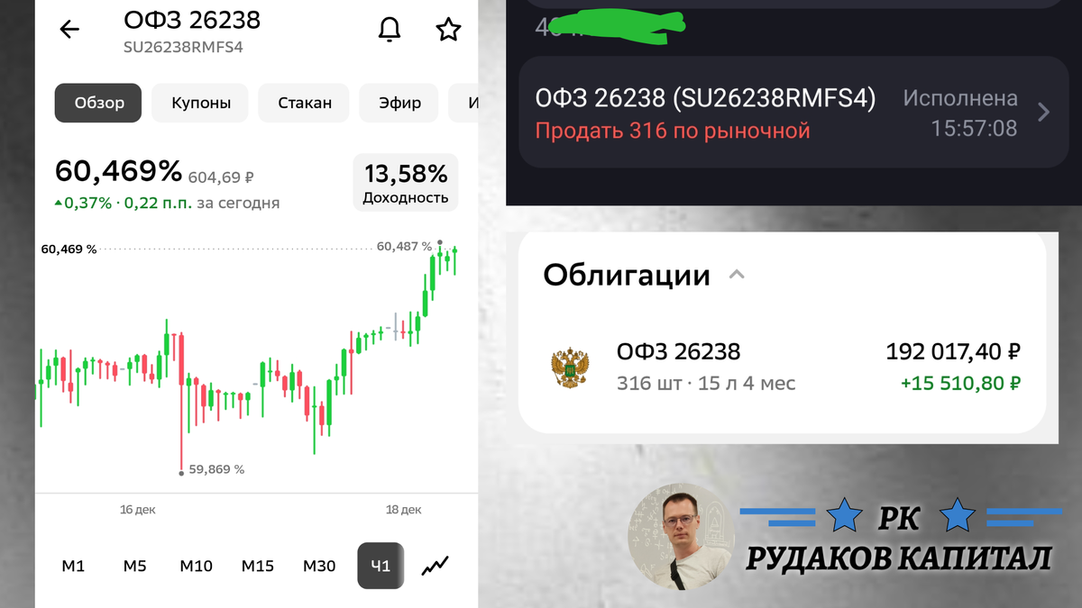На момент закрытия позиции текущая доходность ОФЗ 26238 составляла 13.58% годовых.