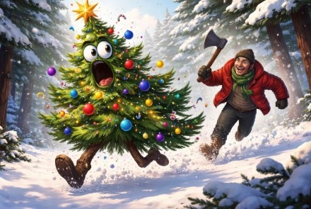Мужик несёт ёлку. Заснеженные ветви покорно повисают, поблескивая в свете редких фонарей. Морозный воздух щиплет щеки, но мужик, кряхтя, уверенно шагает вперед. Ёлка пахнет лесом, надеждой и приближающимся праздником. Он уже предвкушает, как она будет стоять в углу комнаты, украшенная разноцветными игрушками и гирляндами. Вдруг, он чувствует странную вибрацию. Сначала легкую, едва заметную дрожь, словно от проезжающего мимо грузовика. Потом вибрация усиливается, становится более отчетливой, ощутимой. Мужик останавливается, хмурит брови, пытаясь понять, что происходит. И тут он видит – в самом основании ёлки, под густой хвоей, что-то шевелится. Из-под ветвей, словно из темного чрева, появляются… ноги. Длинные, тонкие, корявые ноги, похожие на корни старого дерева. Они неспешно, но целенаправленно ощупывают заснеженную землю, и ёлка, до того покорно висевшая в руках мужика, начинает вырываться. И вот - сильный рывок ... и она освобождается от хватки, и… убегает. Мужик стоит, остолбенев.