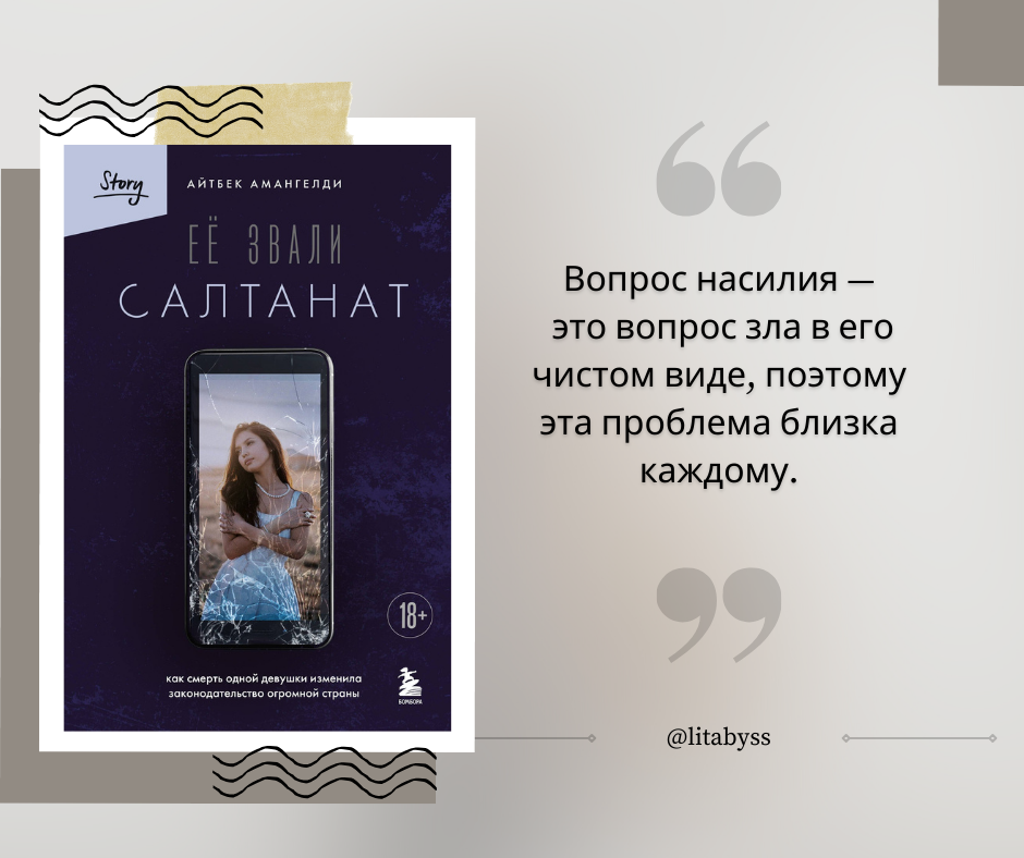 Признаюсь: история Салтанат прошла мимо меня. Может, и встречалась в потоке новостей, но не зафиксировалась — в конце концов, каждый день из новостных каналов летит столько кровавого, возмутительного и просто печального. Книгу я увидела случайно и сразу поняла, что за ней стоит как раз такая история — это ясно уже из названия. И история эта, скажу я вам, стара как мир, болезненно актуальна в прошлом, настоящем и, увы, наверняка останется актуальной в будущем. А это самое страшное. Итак, в Казахстане в одной любящей семье родилась и выросла девочка Салтанат, красивая, светлая и талантливая. И все у нее было прекрасно, пока она не встретила одного мужчину. Поначалу он казался очень хорошим человеком: именитый, образованный, приятный… В общем, началось все как будто с любви, а закончилось домашним насилием. Семья пыталась помочь, но не успела — благоверный забил Салтанат до смерти. По счастью, дело получило широкий общественный резонанс, в противном случае, велика была вероятность, что уб
