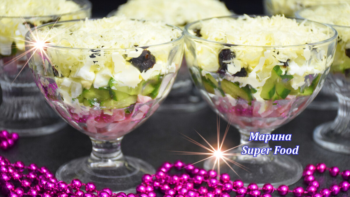 Сегодня делюсь моим любимым рецептом очень вкусного салата "Жемчужина". В этом простом и одновременно оригинальном блюде идеально сочетаются все продукты. ПРОДУКТЫ ДЛЯ РЕЦЕПТА ВЫ НАЙДЁТЕ В КОНЦЕ ЭТОЙ СТАТЬИ. 1. Первым делом ставим вариться куриные яйца вкрутую (10 минут после того как вода закипит). Репчатый лук нарезаем на кубики. Его нужно замариновать. Перекладываем в миску. 2. Всыпаем соль, и сахар. Вливаем уксус столовый 9%. Все перемешиваем. 3. Вливаем крутой кипяток, так чтобы лук покрылся. Оставляем на рабочем столе примерно на 30 минут, можно на дольше. 4. В это время очищаем вареные яйца и измельчаем их на мелкие кубики. Ветчину нарезаем тонкой соломкой. 5. Свежие огурцы также нарезаем на тонкие ломтики. 6. Маринованный лук сливаем в дуршлаг и даем стечь жидкости. Заранее тщательно промытый и уже обсушенный чернослив без косточки нарезаем на мелкие кусочки. 7. Такой салат можно готовить как в общем праздничном блюде, так и в порционных креманках. Первым слоем раскладываем лом