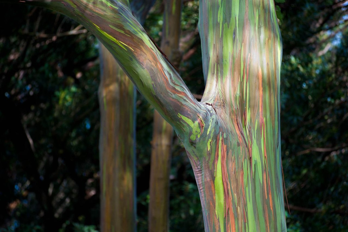 Природа всегда найдёт чем удивить) Казалось бы, что может быть интересного в деревьях на первый взгляд?) А потом смотришь на радужный эвкалипт и челюсть со звоном отваливается. Эта безумная палитра цветов - классический вариант «так пошла эволюция», без каких-то сверхзадач, просто так получилось)) Кора радужного эвкалипта постепенно отслаивается при росте, как и у земляничного дерева. Это явления называется эксфолиацией (отшелушивание). За счёт сбрасывания полосочек коры, дерево избавляется от грибковых болезней, лишайников и мхов, а заодно растёт в толщину без затруднений. 🌱 Самая свежая и молодая кора имеет зеленый цвет за счёт хлорофиллов, затем под действием ультрафиолета хлорофилл разрушается и ему на смену приходят антоцианы. 🤩 Антоцианы - это пигменты, накапливающиеся в вакуолях клеток и меняющие свой цвет от голубого до красного при изменении pH. Со временем синие полосы на коре становятся красными из-за закисления содержимого клеток. 🌼 За рыжие и жёлтые цвета ответствен